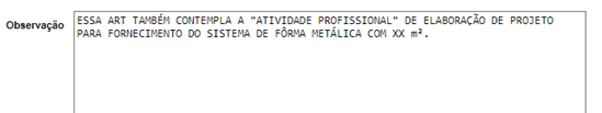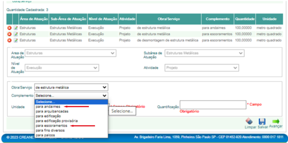 Após preenchimento dos campos, Área de atuação (Estruturas), Subárea de atuação (Estruturas Metálicas), Nível de atuação (Elaboração ou execução) e Atividade (Projeto), clicamos em Salvar e continuamos o preenchimento, em Obra/Serviço (sempre colocar de estrutura metálica) dessa forma o campo Complemento nos dará a opção de escolher o sistema para andaimes ou para escoramento, note que nesse campo não tem para fôrma metálica, nesse caso colocamos todas as informações sobre o projeto para fôrma metálica, incluindo unidade e área no campo observação.