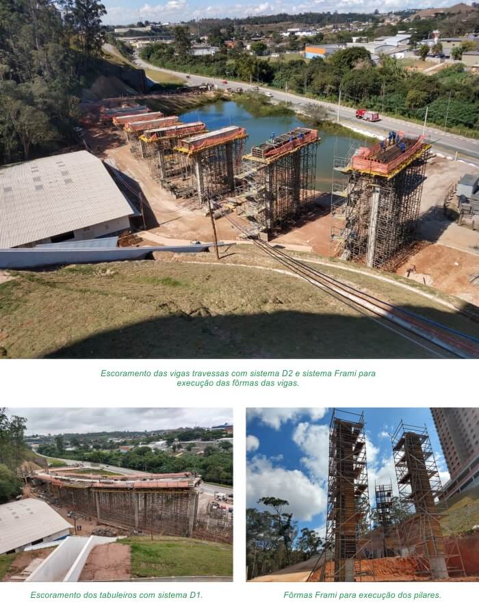 Iniciamos o fornecimento do escoramento com a torre de carga D2, mais robusto, no decorrer da obra o empreiteiro questionou se não tínhamos algo mais leve, pois sua equipe oriunda da construção predial estava com dificuldades, mesmo com toda orientação técnica Doka a produtividade era baixa, foi quando viabilizamos o sistema de torres de carga D1 para o tabuleiro, fato que proporcionou uma maior produtividade para obra, pois parte da equipe tinha uma maior experiência com o sistema D1, por ter trabalhado com o mesmo em outras obras.