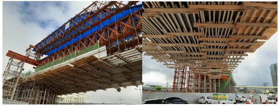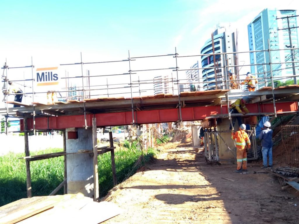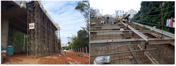 A Mills Solaris participou desde o início com soluções que trouxeram produtividade e agilidade à obra. Na fase da execução dos pilares dos viadutos e elevados foi utilizado o sistema de formas circulares, já na fase de execução das travessas foi utilizado o sistema de escoramento apoiado em perfis metálicos de alta resistência em “block out”, dispensando a utilização e apoio de torres metálicas na marginal do rio (vide imagem 2), agregando economia ao cliente em execução de infraestrutura para apoio das torres.