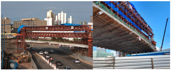 Para execução do Elevado 01 (viaduto em curva), especificamente no trecho mais complexo da obra, que era sobre a Avenida Antonio Carlos Magalhães, encontramos um grande desafio para cimbramento do vão 02. Foi limitado pela prefeitura um gabarito de 5,00m de altura de vão livre sobre a via pública (que continuou em operação). Adotamos um sistema de escoramento suspenso (vide imagens 3 e 4), com Treliças M-150 Mills Solaris, um equipamento desenvolvido especialmente para situações complexas, ideal vencer grandes vãos, altas capacidades de carga e o único no mercado que absorve momento negativo. As Treliças M-150 foram apoiadas em perfis metálicos e torres dos equipamentos: Sistema Modular Mills (SM), um equipamento que absorve grandes capacidades de carga e ideal para geometrias complexas e Alumills, um sistema leve em alumínio e que garante alta resistência de carga.