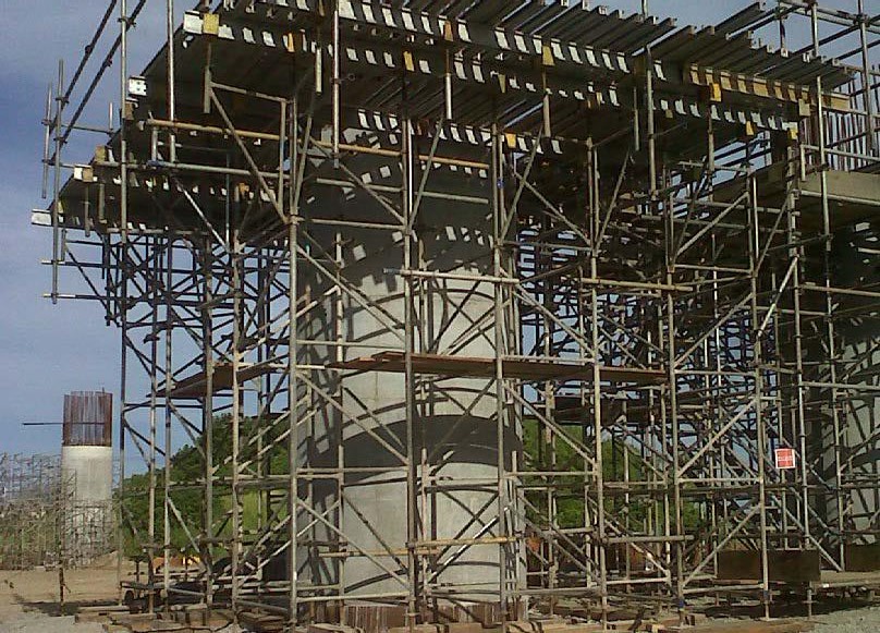 Os cimbramentos dos vãos em terra foram executados com as torres metálicas tipo ETEM, que possuem alta capacidade de carga, travamentos em estrutura tubular e, sobre as torres, vigas metálicas. Foram desenvolvidas soluções sofisticadas, envolvendo a transposição da ferrovia, não sendo possível o apoio do cimbramento diretamente no solo e necessitando vencer grandes vãos livres com perfis metálicos.