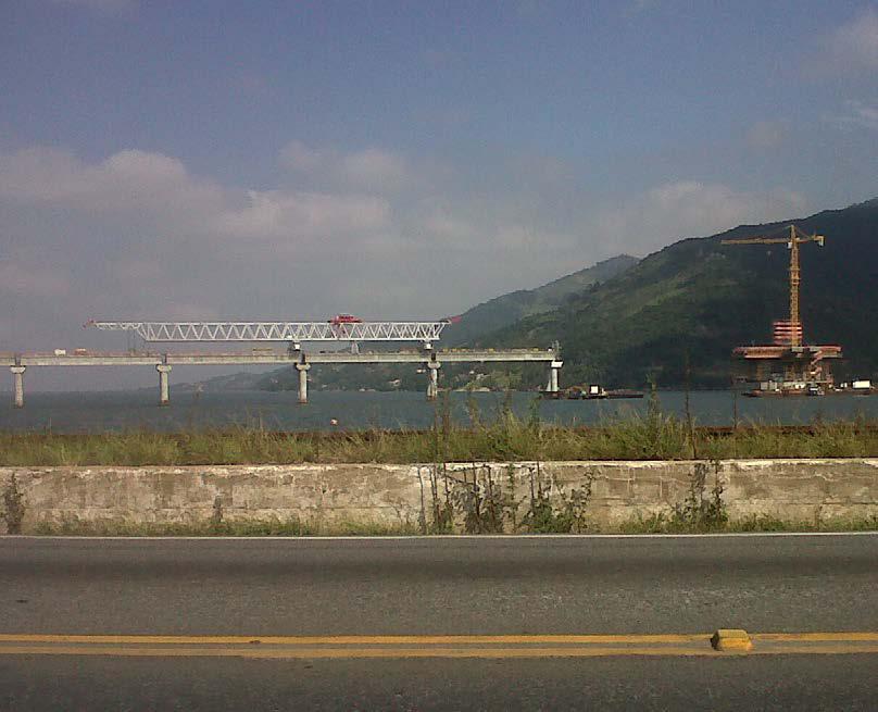 Foram montadas estruturas de suporte sobre o tabuleiro da ponte para a montagem da treliça que lançou as aduelas pré-moldadas. Foi um projeto bastante complexo, envolvendo esforços que exigiram soluções especiais para viabilizar a montagem.