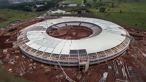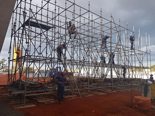Utilizamos o sistema de tubo de encaixe (andaime multidirecional speed) o que possibilitou a montagem e desmontagem rápida.