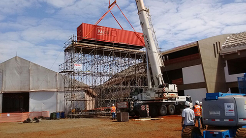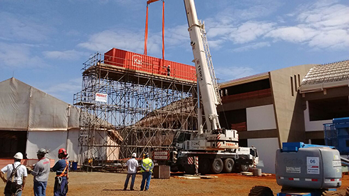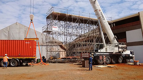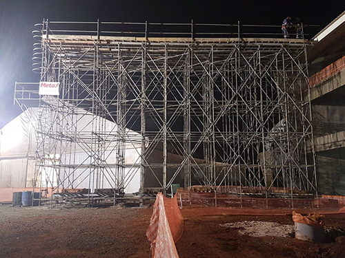 O cliente precisava de uma estrutura que suportasse um container de 16 toneladas mais uma bobina de 3 toneladas. Dentro do container há uma refiladora que produz as telhas da cobertura e por este motivo era necessário que o nosso andaime além de suportar esta carga ele tivesse a altura de 10,50m pois assim que produzida a telha é aplicada no local. Um dos grandes desafios era como resolver a estabilidade do andaime sem utilizar estaios, devido a várias interferências no local, após vários estudos optamos pela utilização de contrapesos para balancear a estrutura.