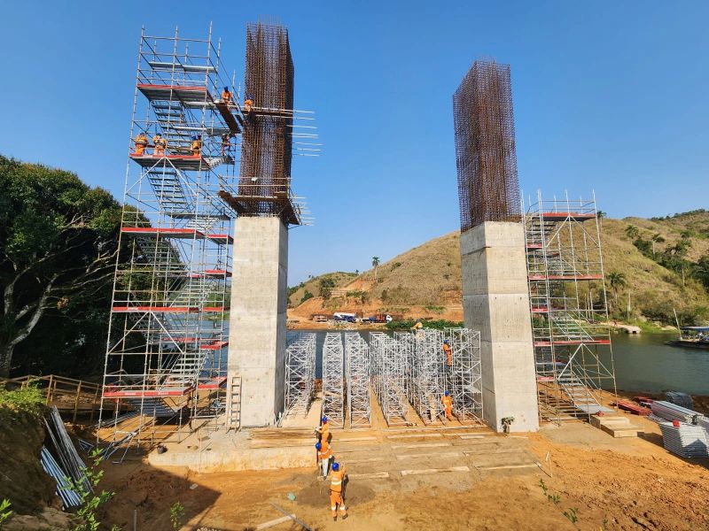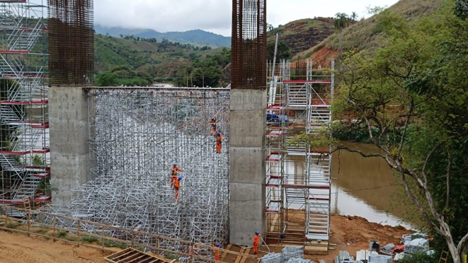 Para esse projeto foi dimensionado e aplicado de 115 ton., de escoramento utilizando-se torres metálicas contraventadas entre si com tubo e braçadeira formando uma estrutura monolítica resistindo aos esforços solicitantes e às intercorrências do clima. Entretanto após a execução dos Mastros 1 e 3, margem esquerda do rio na cidade de Itaoca-SP, o Sistema completo de escoramento, formas metálicas Metax  e  Sistema Multidirecional SPEED (Escadas de acesso) serão remanejados para a margem direita do rio na cidade de Adrianópolis-PR, para a execução dos mastros 2 e 4 e suas respectivas aduelas de disparo.