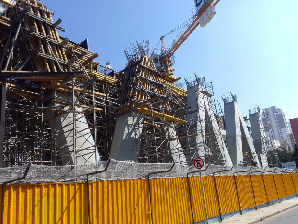 Devido ao elevado ângulo desses pilares, surgem grandes esforços horizontais na estrutura do próprio pilar e outro esforço cortante na viga de transição, em que há a mudança de direção desses pilares. Nesse caso, a viga que recebe essa mudança de seção chega a suportar quase 1.000 tf de tração, sendo necessária a protensão para o equilíbrio desses esforços. Essas vigas foram escoradas pelo sistema de torres de carga D2 da Doka. Esse sistema foi também utilizado como escoramento de alta capacidade de carga no PD, quádruplo de 13,09 m, e para solucionar o pavimento de transição, com vigas de aproximadamente 1,50 m de altura.
