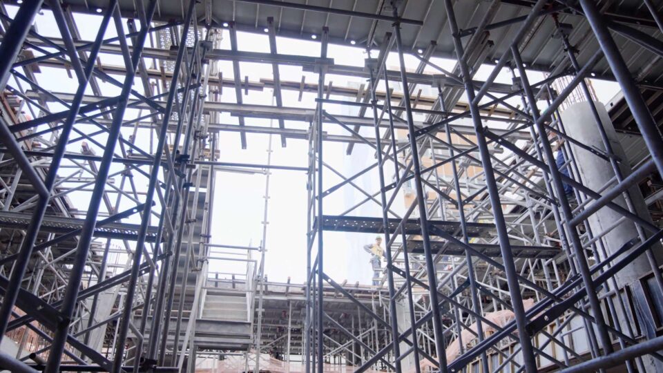 Além disso, foram utilizadas fôrmas Concreform SH® para as paredes e fôrmas circulares para os pilares, garantindo precisão e qualidade no acabamento. As estruturas de acesso Modex® SH foram empregadas tanto nas fachadas internas quanto externas do casarão, facilitando o trabalho em alturas elevadas, como o pé-direito de seis metros e 47 centímetros, um aspecto desafiador da obra.